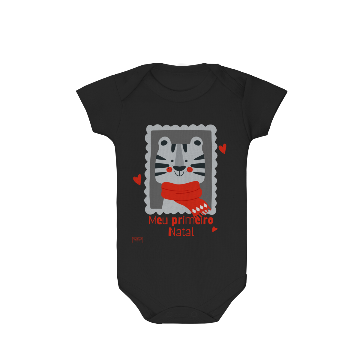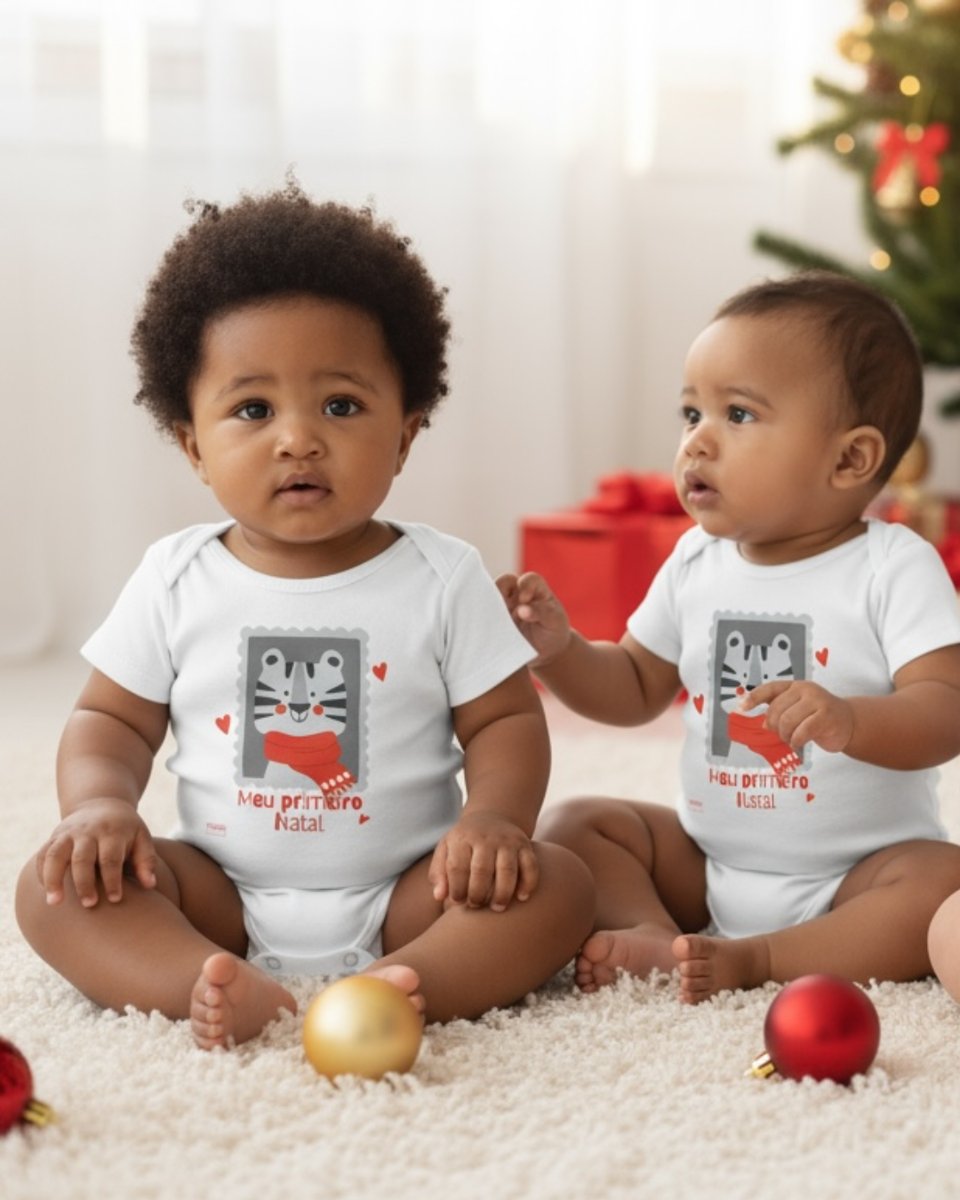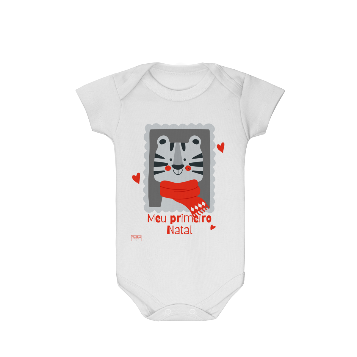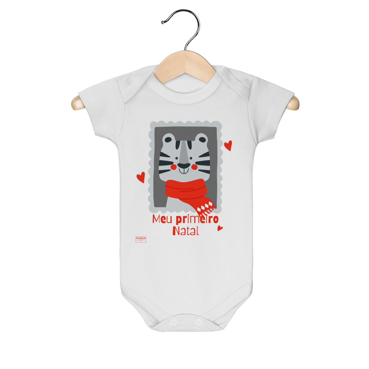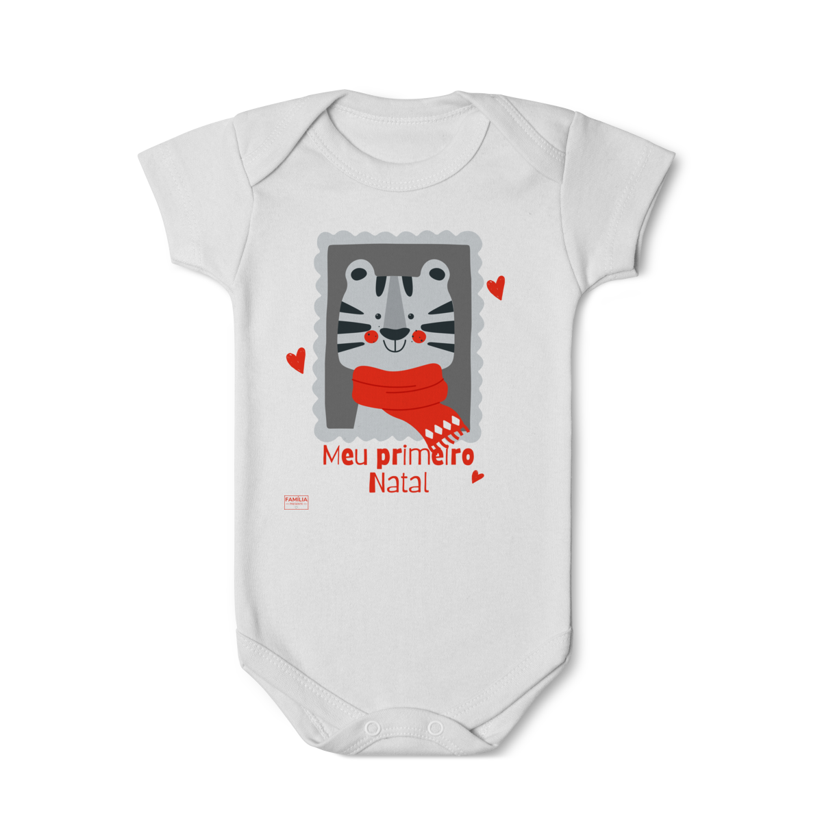 O Body Infantil Tigre – Meu Primeiro Natal é confeccionado em malha 100% algodão, com estampa exclusiva de tigre natalino e acabamento suave ao toque, garantindo conforto e liberdade de movimento ao bebê.