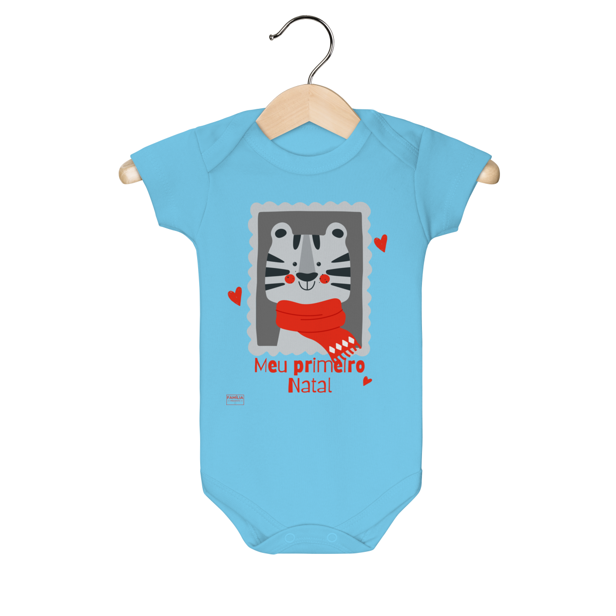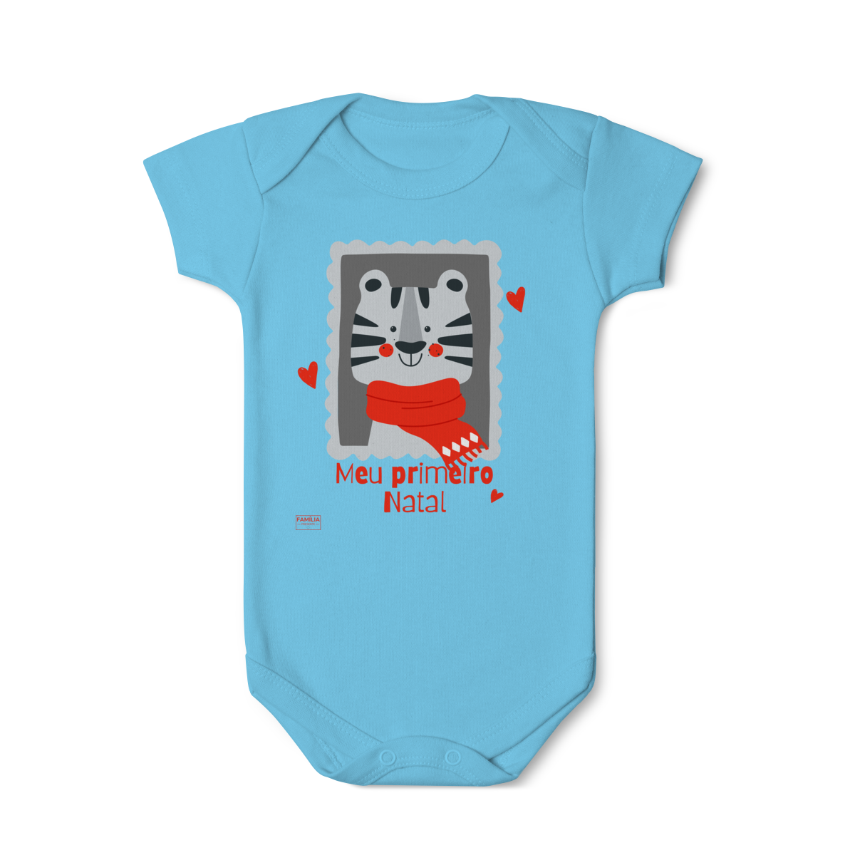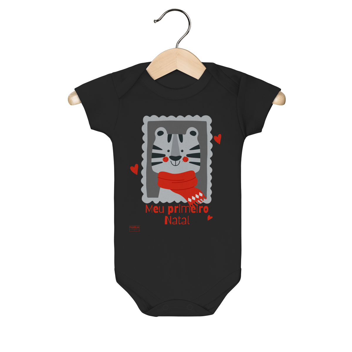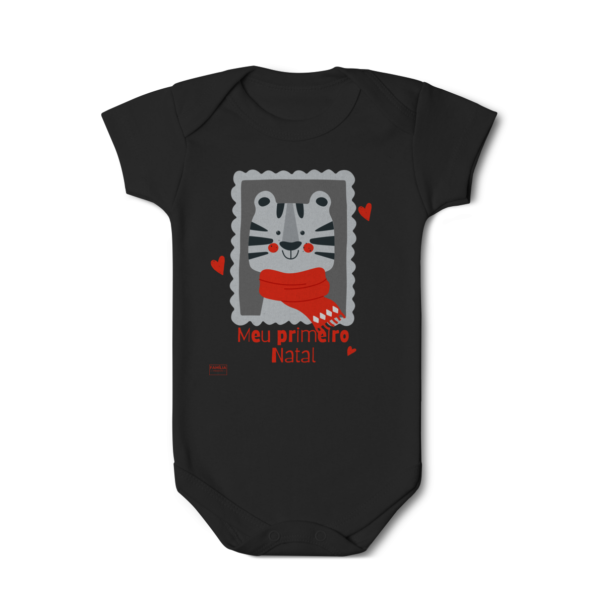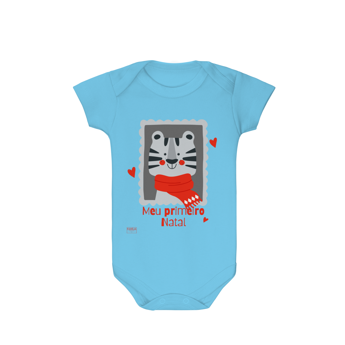O Body Infantil Tigre – Meu Primeiro Natal é confeccionado em malha 100% algodão, com estampa exclusiva de tigre natalino e acabamento suave ao toque, garantindo conforto e liberdade de movimento ao bebê.