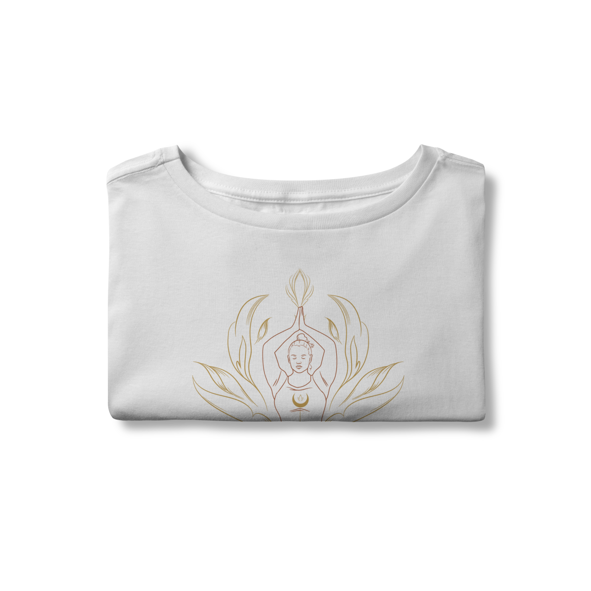 As linhas douradas representam o fluxo da respiração, enquanto o corpo em meditação simboliza a conexão entre força e serenidade — essência da prática de yoga, meditação e alongamento consciente.
