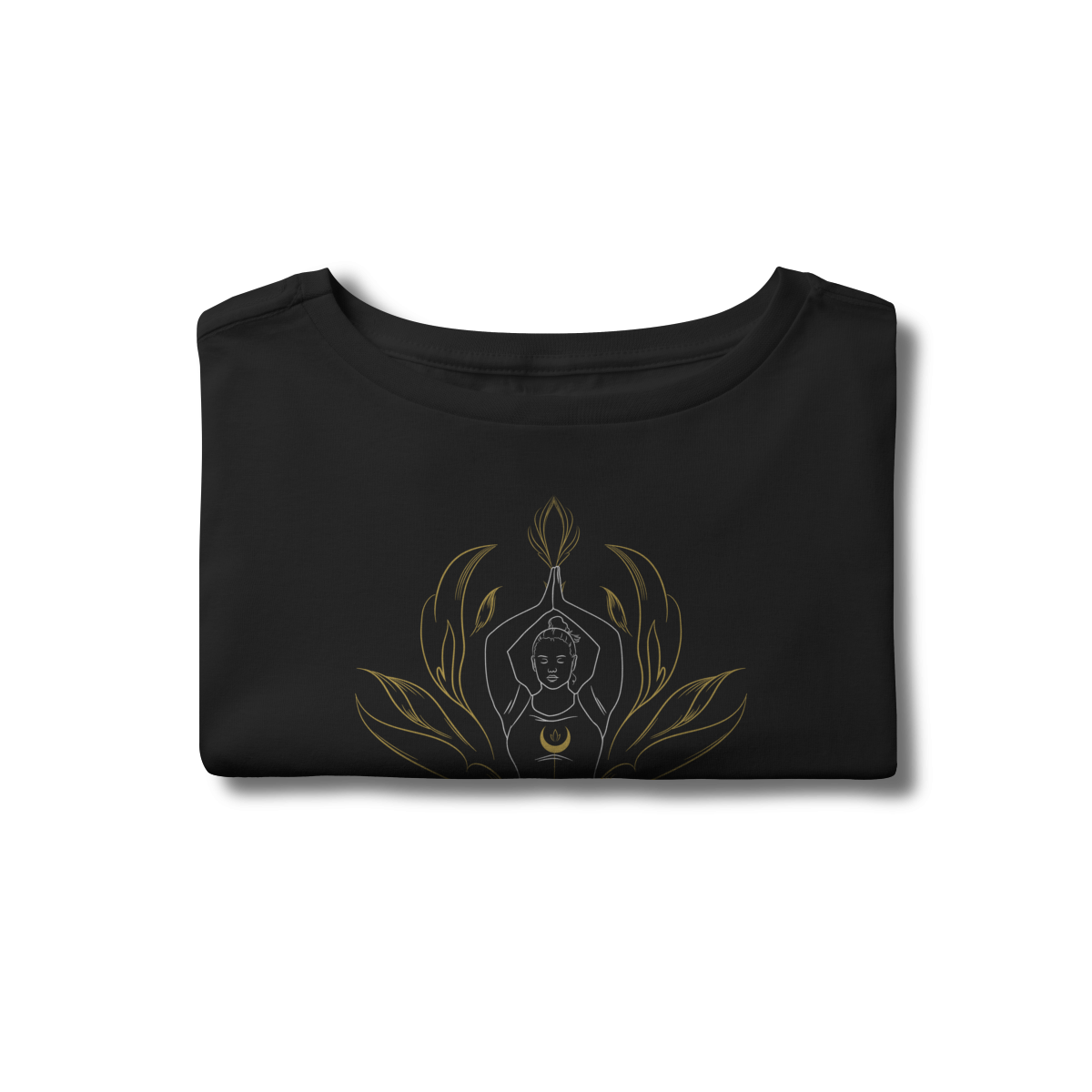 As linhas douradas representam o fluxo da respiração, enquanto o corpo em meditação simboliza a conexão entre força e serenidade — essência da prática de yoga, meditação e alongamento consciente.