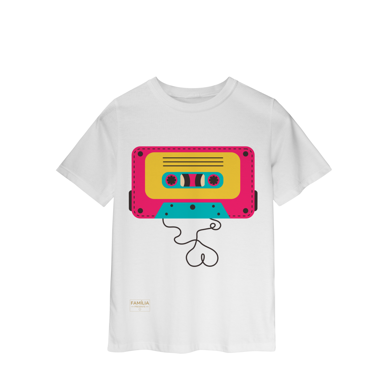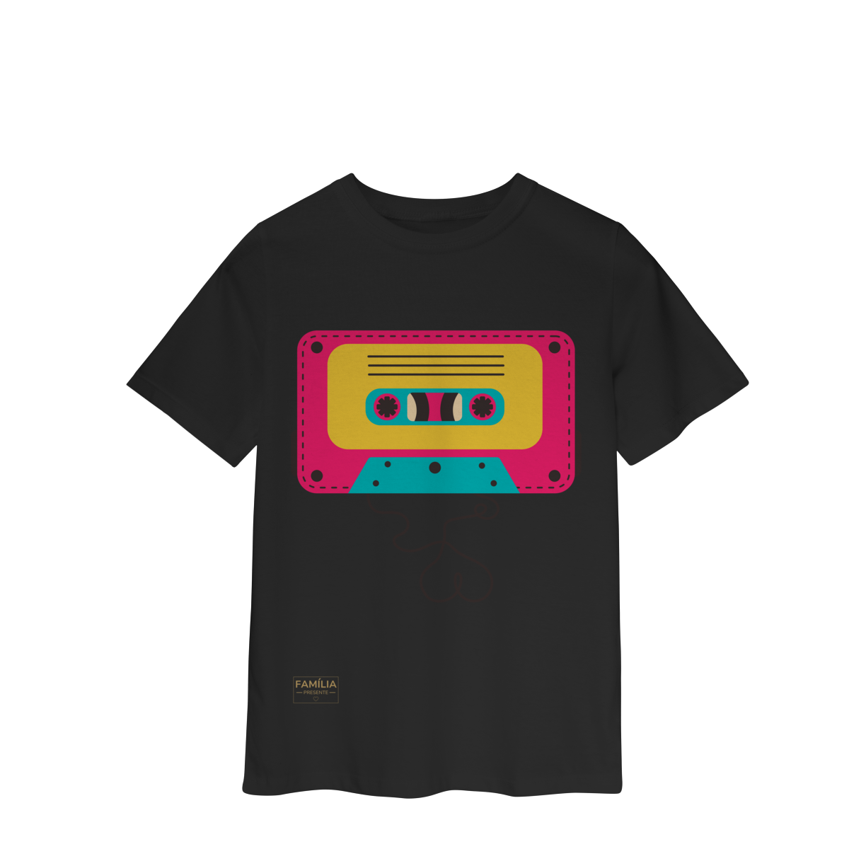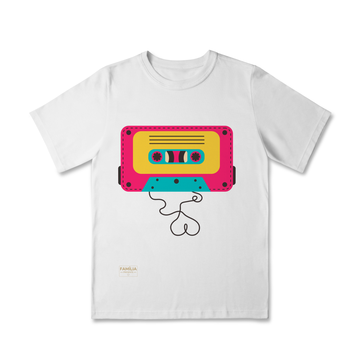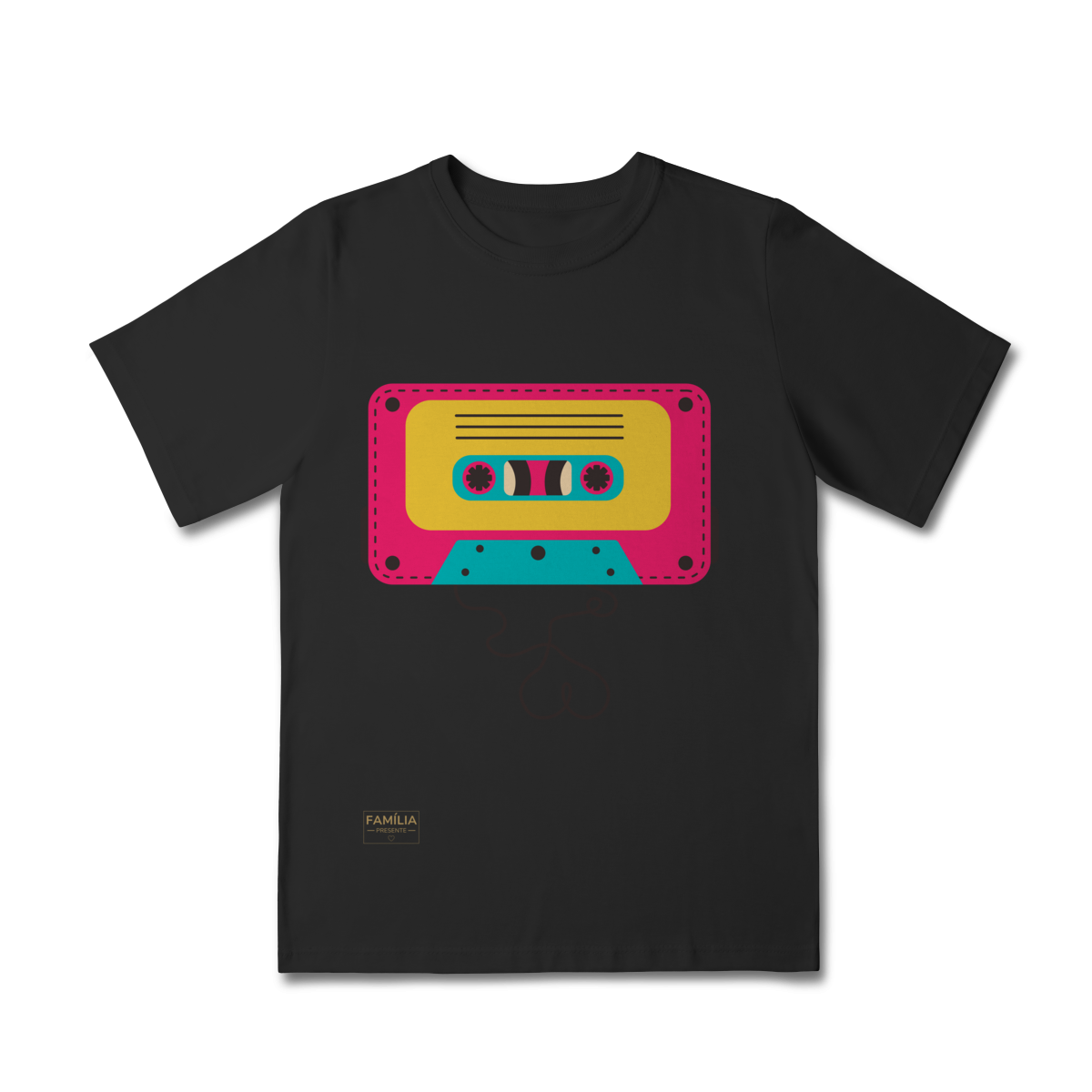 Camiseta FITA CASSETE celebra os dias em que a trilha sonora vinha enrolada em fita — e cada lado tinha um sentimento diferente.