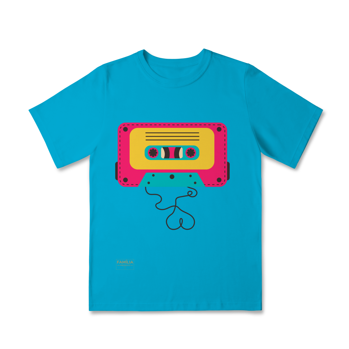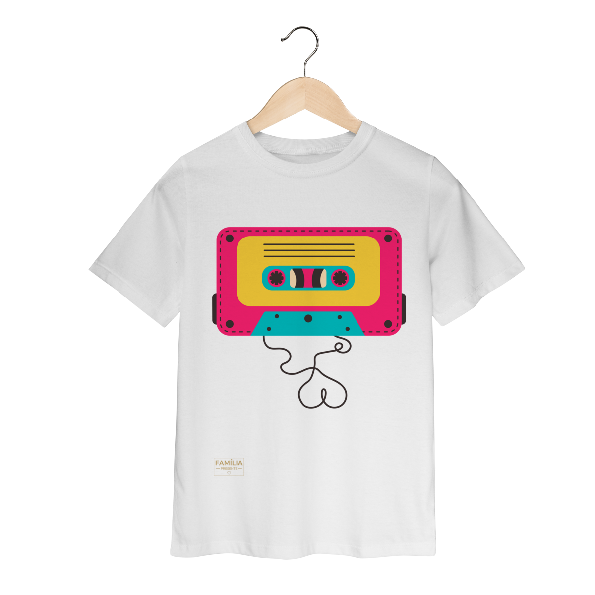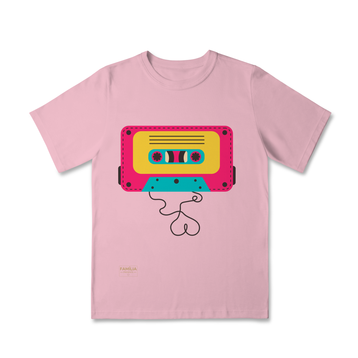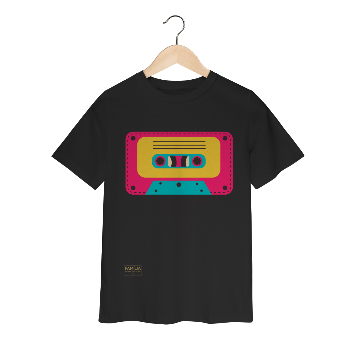 Camiseta FITA CASSETE celebra os dias em que a trilha sonora vinha enrolada em fita — e cada lado tinha um sentimento diferente.