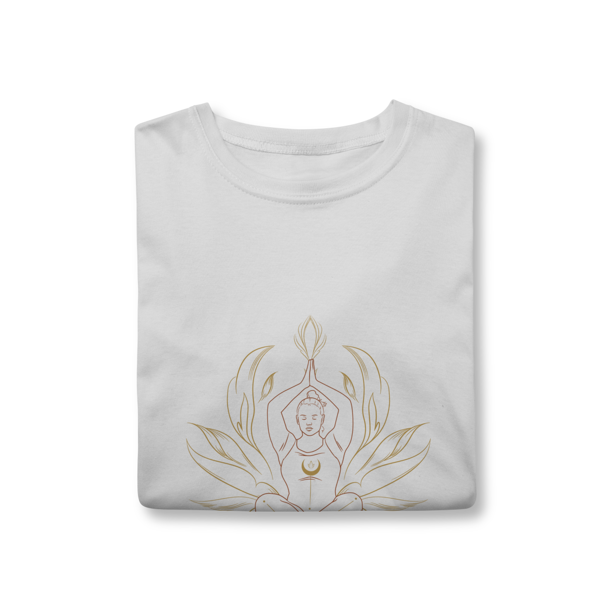 As linhas douradas representam o fluxo da respiração, enquanto o corpo em meditação simboliza a conexão entre força e serenidade — essência da prática de yoga, meditação e alongamento consciente.