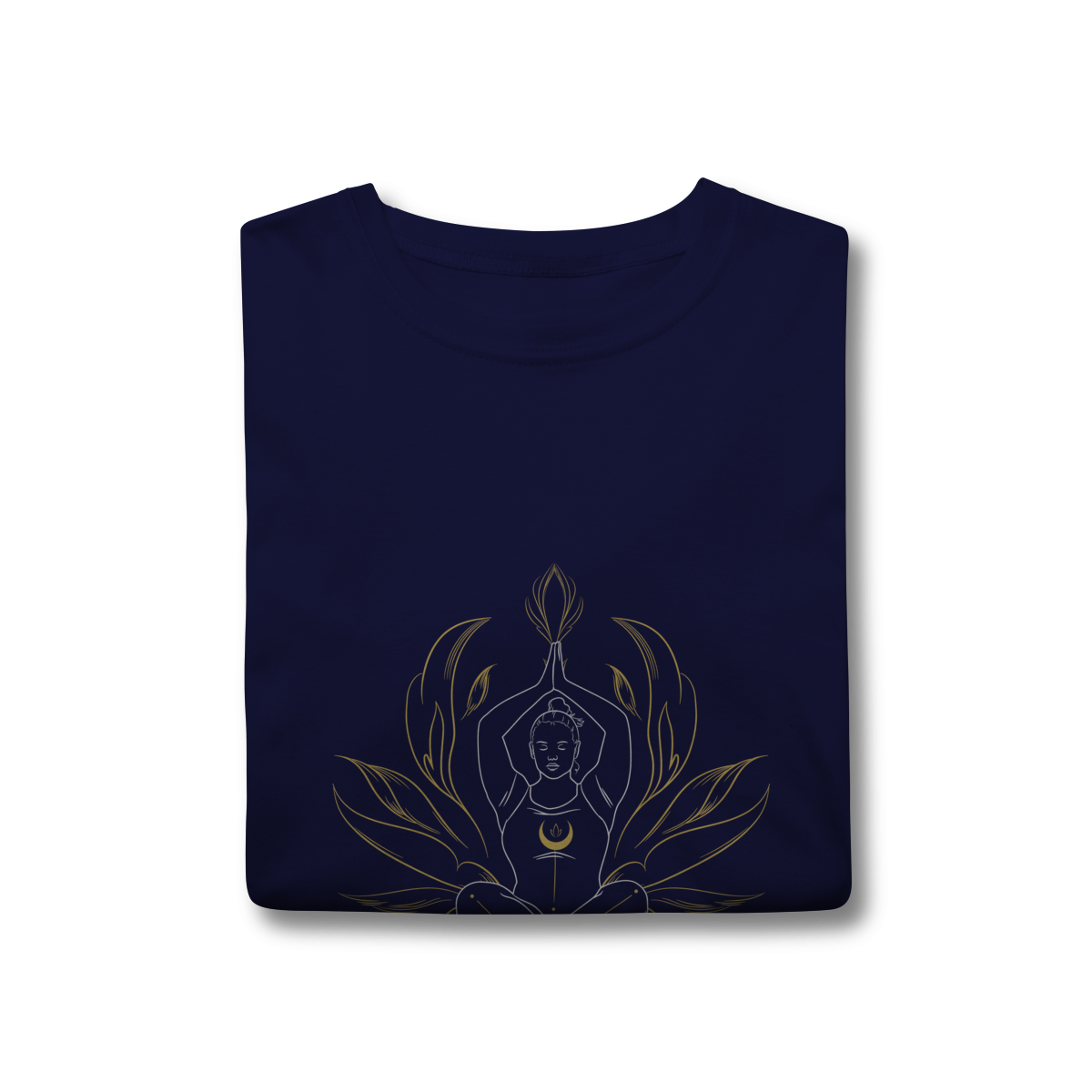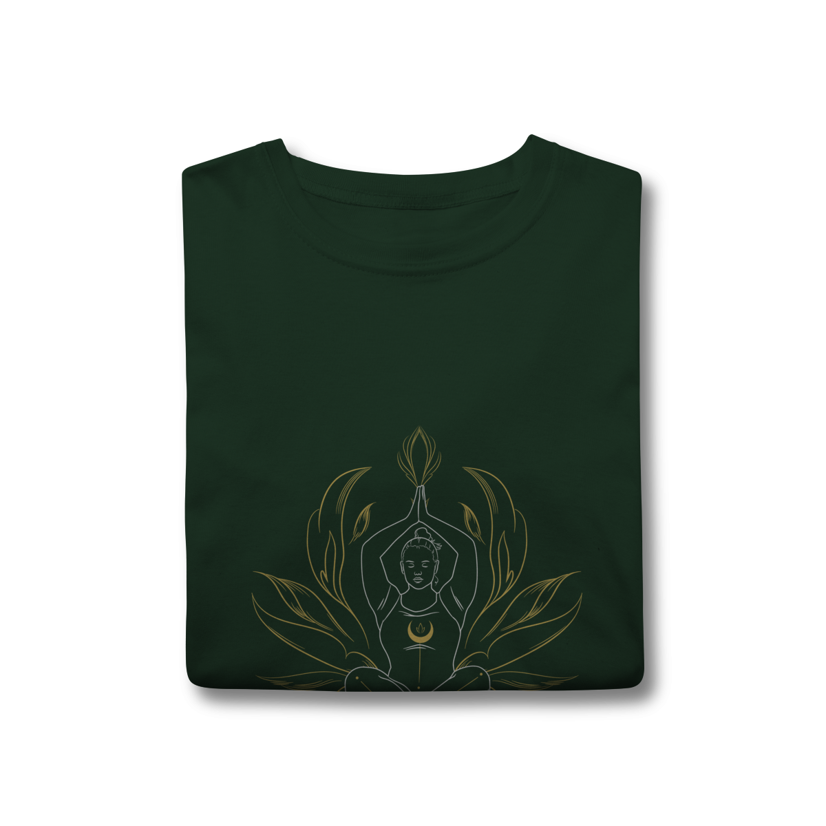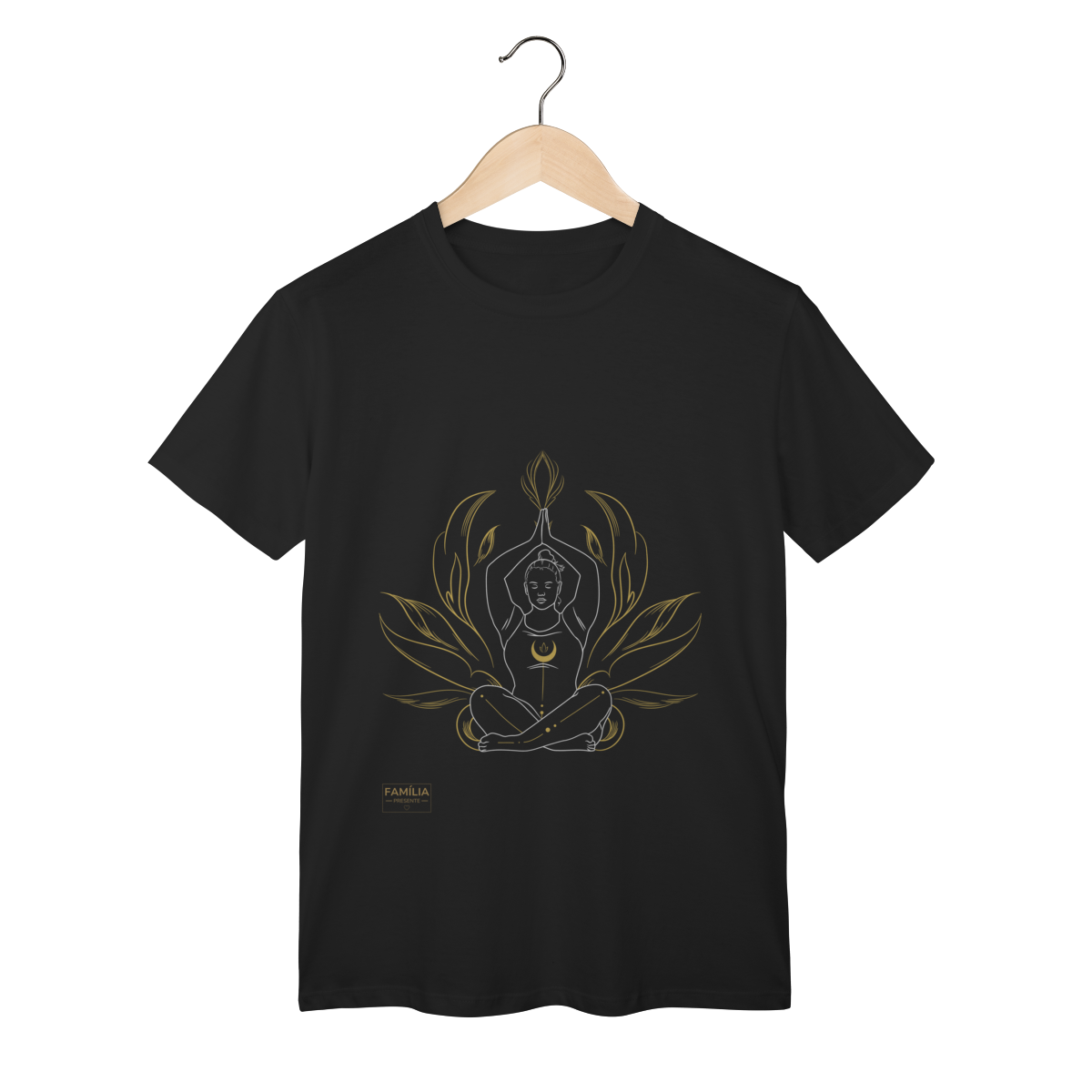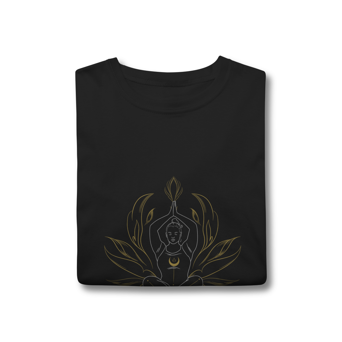 As linhas douradas representam o fluxo da respiração, enquanto o corpo em meditação simboliza a conexão entre força e serenidade — essência da prática de yoga, meditação e alongamento consciente.